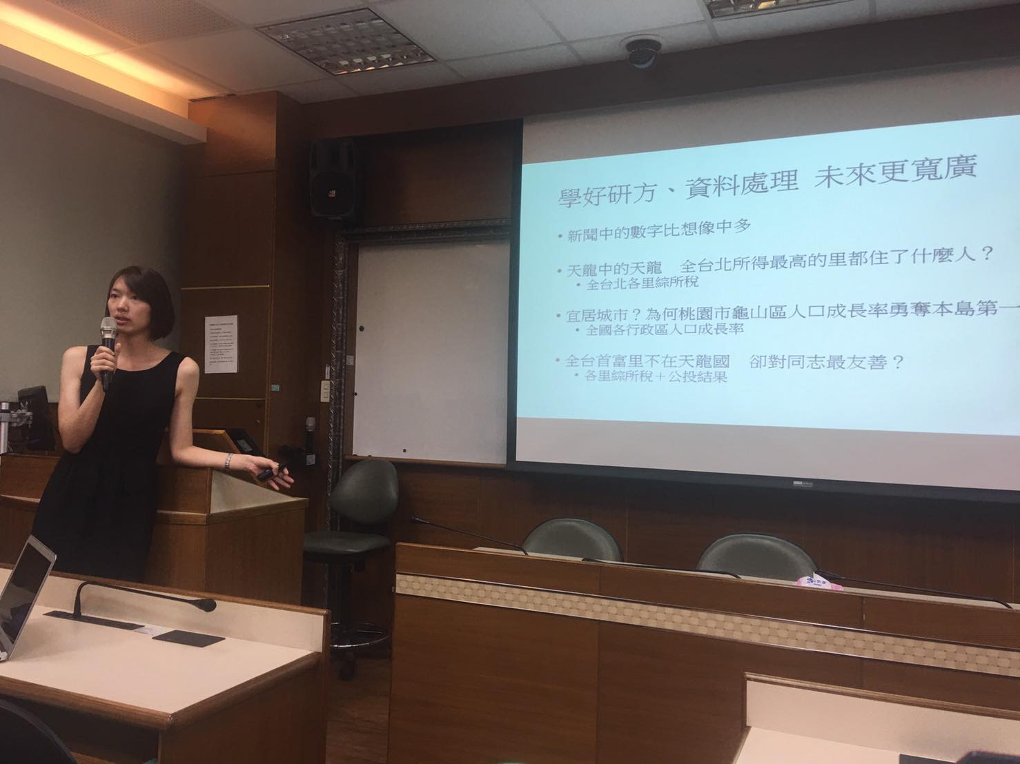 這場演講的主題是新聞中的數字及意義。伍小姐提醒大家,學習研究方法是為了培養對資料、數字的敏銳度。在走過了SPSS, Stat, 到R的路,工具選用是其次,關鍵是你能不能熟悉工具之後,「用數字找新聞」、「會不會對數字問問題?」她分享了三個她參與的報導。她曾經從台北各里綜所稅的資料,找到「天龍中的天龍」、台北內湖某個所得最高的里,發問「裡頭的人與其他人有什麼不一樣?」經過親訪里長之後,發掘出那裡的人低調不喜歡被打擾的特質。又如她去檢視從各行政區人口成長率,發現桃園龜山區人口成長率是全島第一之後,經過親自走訪,發現這是因為社會住宅落成吸引大量新住戶的緣故。再如,她從里綜所稅與公投結果交叉比對後,發現全國首富之里同時也是「最年輕」的里,以及對同志最友善的里。問自己「為什麼」之後,她走訪發現/確認了教育程度高者對同志態度友善,以及富裕人家可能生育率高的現象。這些有趣的例子,都成了天下雜誌報導的題材,也得到編輯的支持發展成可報導的故事。